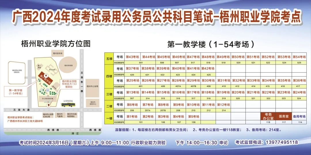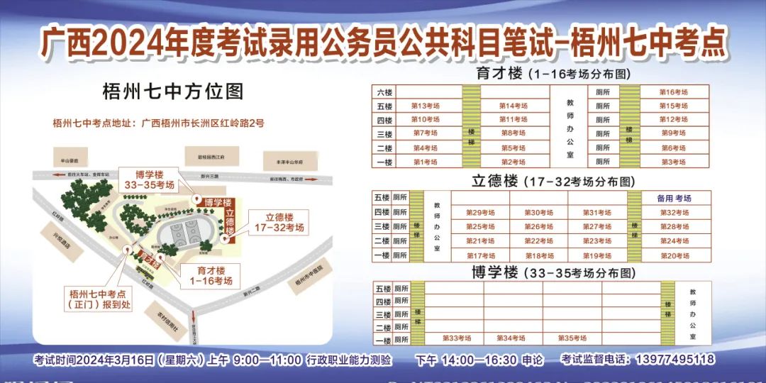 一、廣西2024年度考試錄用公務(wù)員(選調(diào)生)公共科目筆試將于3月16日舉行,梧州考區(qū)共設(shè)置9個考點(diǎn),請考生提前熟悉各自考點(diǎn)位置、周邊環(huán)境及交通情況,考試當(dāng)天提前出門做好準(zhǔn)備,準(zhǔn)時參加考試。特別提示:因考點(diǎn)停車場地有限,所有考生車輛不得進(jìn)入考點(diǎn),請考生規(guī)劃好前往考點(diǎn)的交通方式和路線。