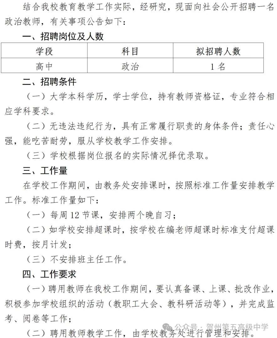 賀州第五高級中學2024年秋季學期招聘教師公告