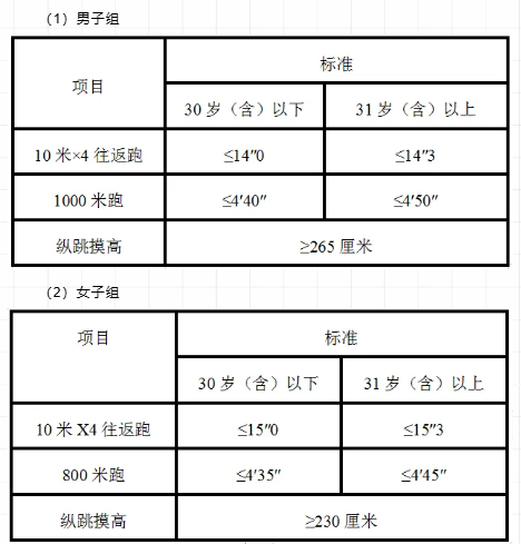 3.參照《關(guān)于印發(fā)公安機關(guān)錄用人民警察體能測評項目和標(biāo)準(zhǔn)(暫行)的通知》(人社部發(fā)〔2011〕48號)的項目及測試規(guī)則,結(jié)合《公安民警體育鍛煉達標(biāo)手冊》成績標(biāo)準(zhǔn),體能測評的項目和標(biāo)準(zhǔn)如下: