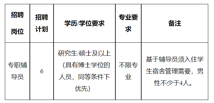(四)年齡不超過30周歲,即1993年12月1日及之后出生;具有博士學(xué)位的,或具有高級職稱的,或有專職輔導(dǎo)員工作經(jīng)驗且在各類輔導(dǎo)員職業(yè)能力競賽、輔導(dǎo)員評優(yōu)評先等活動中獲得過省部級(含)以上獎勵表彰者,年齡可放寬至35周歲,即1988年12月1日及之后出生。