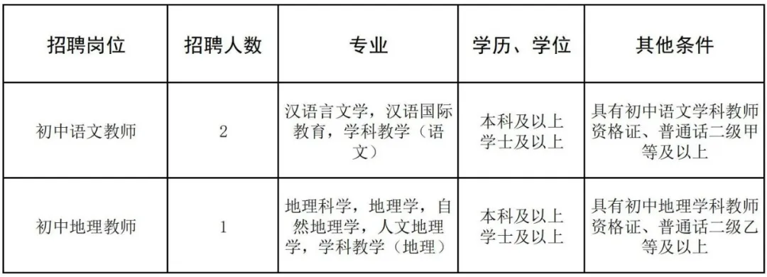 根據(jù)發(fā)展需要,學(xué)校擬招聘初中語(yǔ)文、初中地理頂崗教師共3人,具體招聘信息如下: