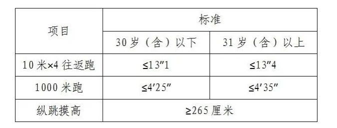 3.體能測評項(xiàng)目和標(biāo)準(zhǔn)按照《公安機(jī)關(guān)錄用人民警察體能測評項(xiàng)目和標(biāo)準(zhǔn)(暫行)》執(zhí)行。