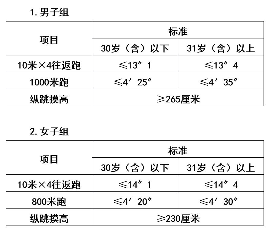 體能測評的項目和標準按照《關(guān)于印發(fā)〈公安機關(guān)錄用人民警察體能測評項目和標準〉的通知》(公政治〔2024〕60號)執(zhí)行,其中綜合管理類、執(zhí)法勤務(wù)類職位測查全部3個項目,警務(wù)技術(shù)類職位免予測查1000米(男)/800米(女)跑項目。對于專業(yè)人才緊缺難以形成競爭的特殊職位(緊缺職位),體能測評三項中有兩項達標的,視為合格。凡應(yīng)測項目中任意一項不達標的,即為體能測評不合格。具體如下:
