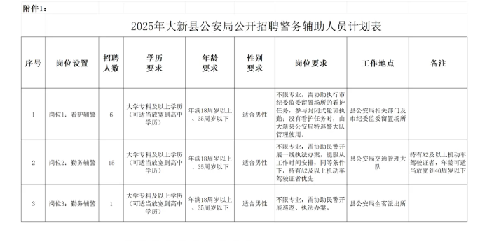為適應(yīng)當(dāng)前社會(huì)治安形勢(shì)的需要,進(jìn)一步充實(shí)公安機(jī)關(guān)警務(wù)輔助力量,推進(jìn)平安大新建設(shè),有效維護(hù)社會(huì)治安穩(wěn)定,根據(jù)《廣西壯族自治區(qū)公安機(jī)關(guān)警務(wù)輔助人員條例》《崇左市公安機(jī)關(guān)警務(wù)輔助人員管理辦法》《崇左市公安機(jī)關(guān)警務(wù)輔助人員管理招聘管理辦法》(試行)等文件精神,經(jīng)縣人民政府同意,大新縣公安局決定面向社會(huì)公開(kāi)招聘警務(wù)輔助人員22名(以下簡(jiǎn)稱(chēng)輔警)?,F(xiàn)將有關(guān)事項(xiàng)公告如下: