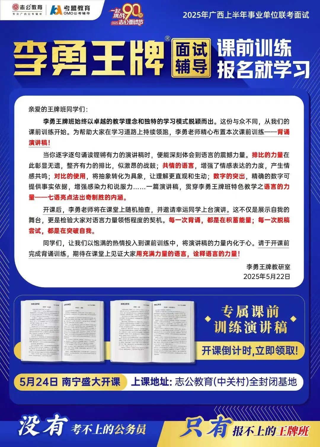 2025年廣西事業(yè)單位面試培訓(xùn)課程 —— 李勇王牌®班在學(xué)員們的熱切期待中正式開班。學(xué)員們陸續(xù)簽到,為助力學(xué)員迅速適應(yīng)學(xué)習(xí)節(jié)奏,志公教育精心準(zhǔn)備了備考大禮包,內(nèi)含歷年課程講義、高分技巧等實(shí)用資料。班主任團(tuán)隊(duì)全程跟進(jìn),細(xì)致講解課程安排、考勤制度及學(xué)員服務(wù),從學(xué)習(xí)到生活,全方位為學(xué)員保駕護(hù)航。
