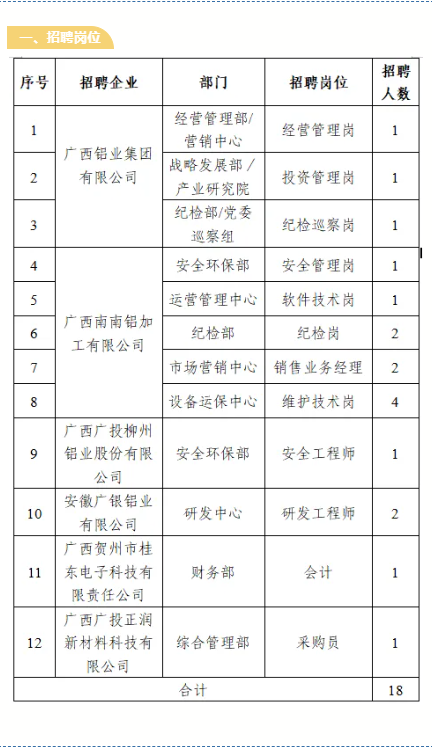 2.報名方式:應(yīng)聘者可登錄廣投集團(tuán)官方網(wǎng)站(http://www.gig.cn),依次點擊“人力資源-廣納英才”,進(jìn)入“社會招聘-招聘崗位”專欄,找到“鋁業(yè)”相應(yīng)崗位并投遞簡歷。