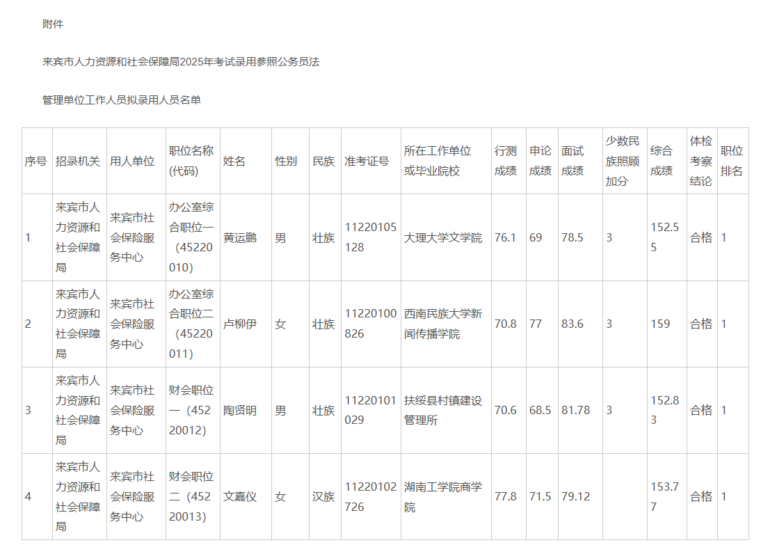 2025來賓人力資源和社會保障局公務(wù)員考試錄用工作人員擬錄用人員公示