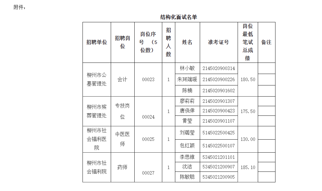(三)面試當(dāng)天全部考試結(jié)束后,考生面試成績(jī)?cè)谑忻裾?2樓公示欄公示,并在廣西柳州市民政局網(wǎng)站(http://mzj.liuzhou.gov.cn/)上公布,請(qǐng)考生自行查閱。