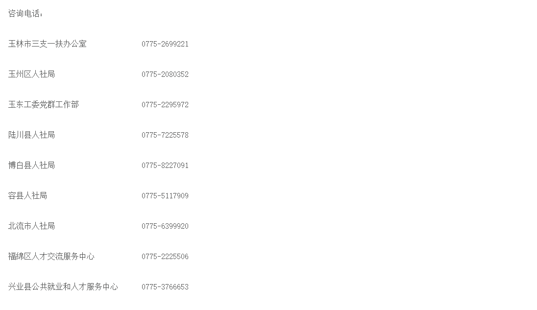 具體事宜可進入廣西高校畢業(yè)生“三支一扶”服務網(wǎng)(http://szyf.gxrc.com)查詢政策或向玉林市“三支一扶”辦公室電話咨詢。