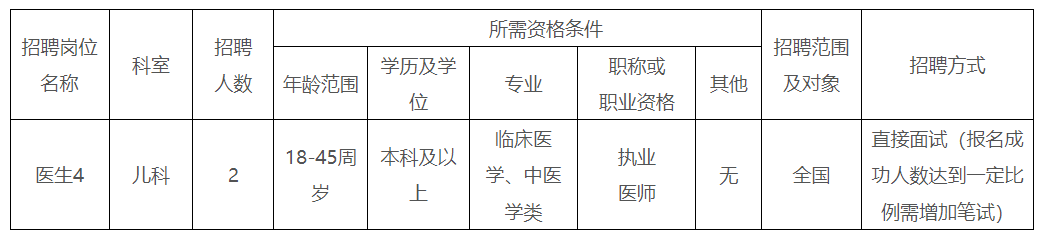 根據(jù)醫(yī)院發(fā)展需要,我院決定面向社會招聘兒科醫(yī)師2名,現(xiàn)將有關事項公告如下: