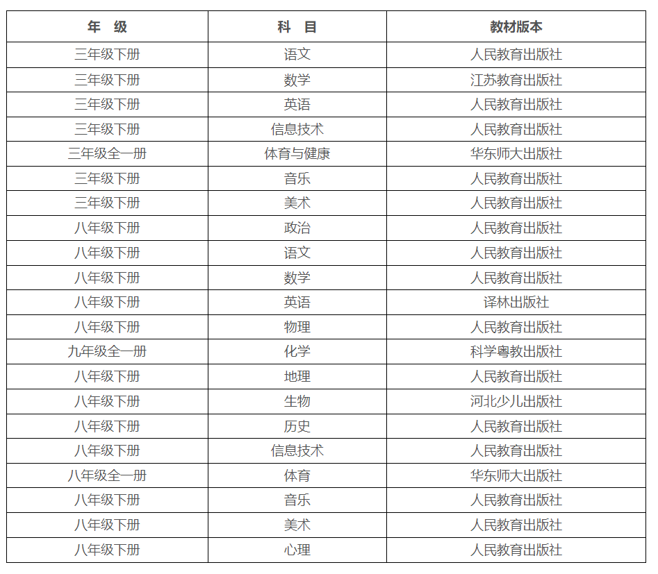 欽北區(qū)2025年春季學期使用的教材內(nèi)容,小學三年級、初中八年級(化學九年級)。教材版本如下: