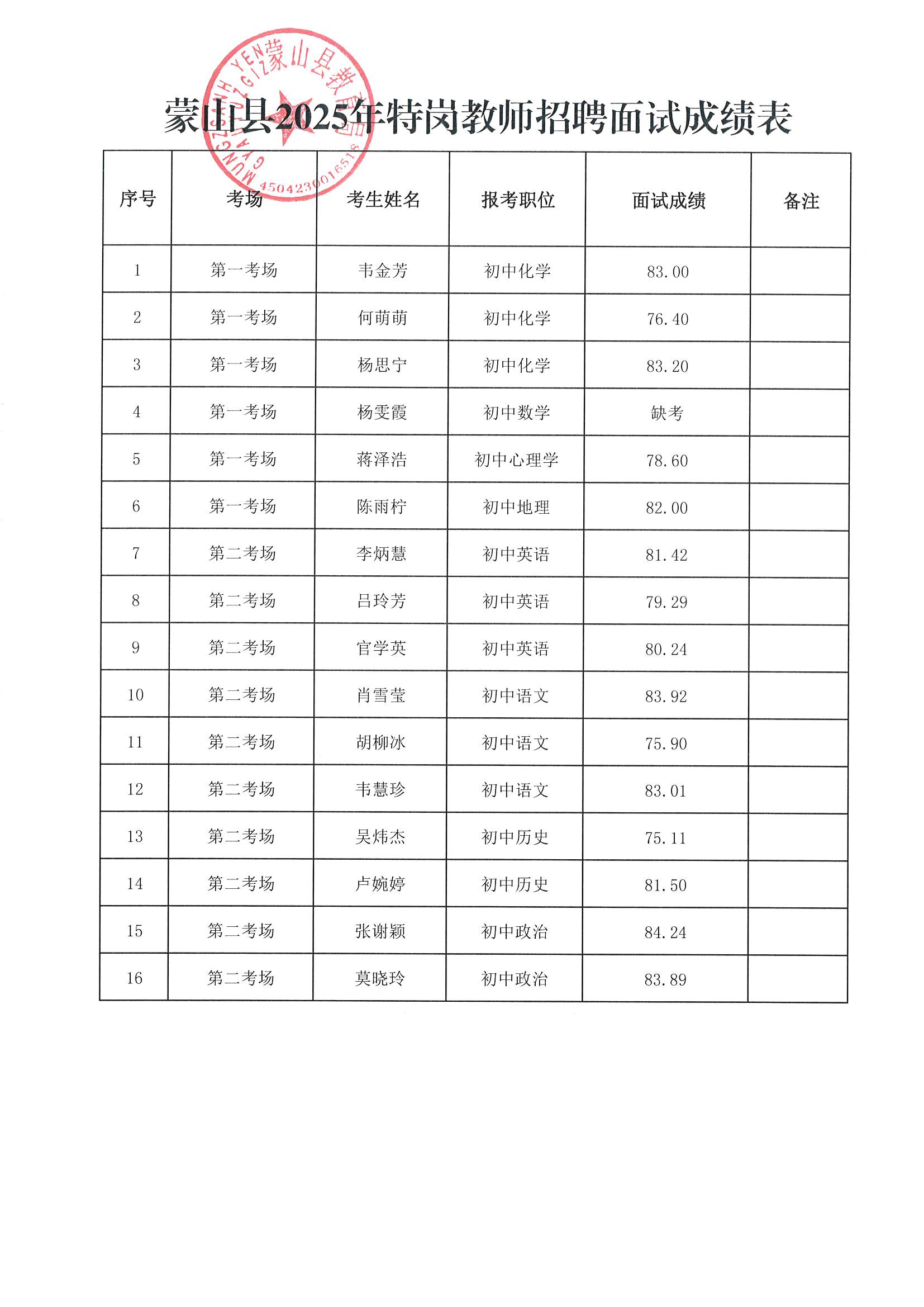 蒙山縣2025年特崗教師招聘面試成績(jī)公告