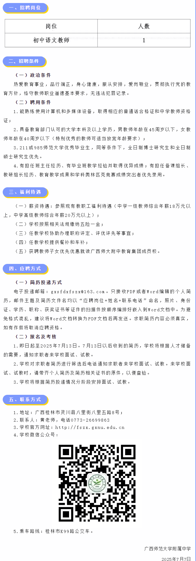 原文標(biāo)題:廣西師范大學(xué)附屬中學(xué)面向全國急聘初中語文教師1名