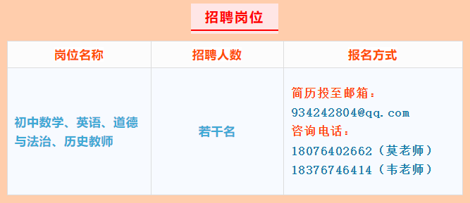 報(bào)名實(shí)行網(wǎng)絡(luò)形式,有意者請(qǐng)將簡(jiǎn)歷投至學(xué)校郵箱934242804@qq.com。具體面試時(shí)間電話(huà)通知。