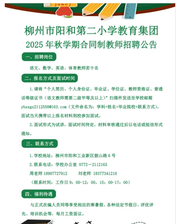 2025年柳州市陽和第二小學教育集團秋學期合同制教師招聘公告
