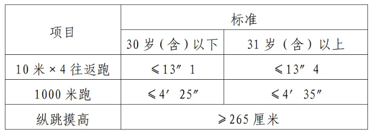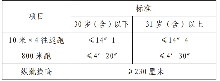 體能測(cè)評(píng)項(xiàng)目中,縱跳摸高的測(cè)試次數(shù)不超過(guò)3次,10米×4往返跑測(cè)評(píng)次數(shù)為2次,1000米/800米的測(cè)評(píng)次數(shù)均為1次。應(yīng)聘勤務(wù)崗位的人員,體能測(cè)評(píng)三項(xiàng)全部達(dá)標(biāo)的方為合格;應(yīng)聘文職崗位的人員,體能測(cè)評(píng)三項(xiàng)有兩項(xiàng)達(dá)標(biāo)的,視為合格。
