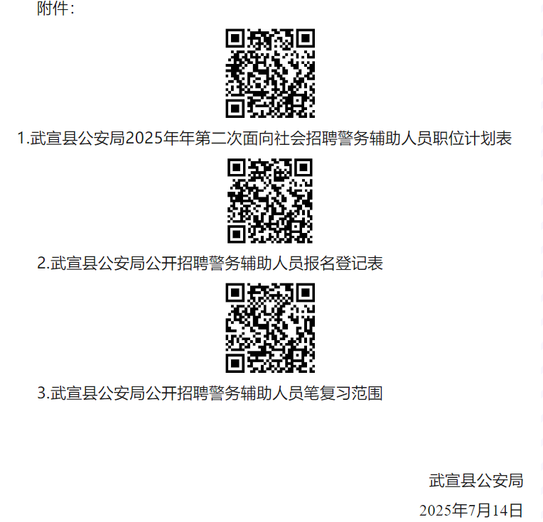 招聘人數(shù):8人,詳見(jiàn)《武宣縣公安局2025年第二次面向社會(huì)招聘輔警職位計(jì)劃表》(附件1)。