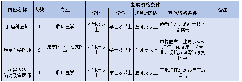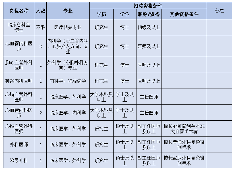 ③列入醫(yī)院人才引進(jìn)目錄或醫(yī)院根據(jù)專科發(fā)展需要的崗位人才,人才資格條件按特殊情況辦理,采用一人一議。