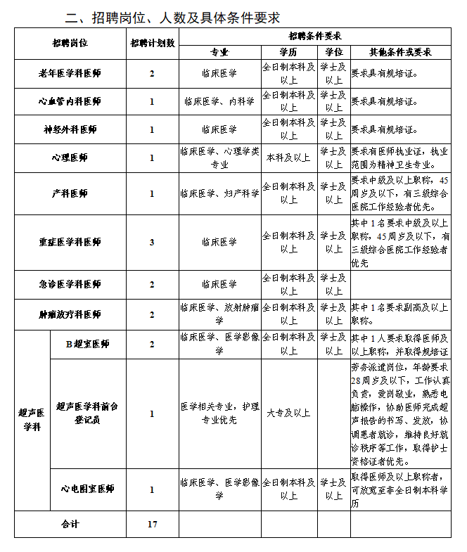 注:初中級(jí)職稱應(yīng)聘人員原則上年齡要求為35周歲及以下;如為副高以上職稱,年齡可放寬至45周歲;學(xué)歷層次高者優(yōu)先。醫(yī)師崗位中如要求具有規(guī)培證條件的是指已取得規(guī)培合格證書(shū)(含通過(guò)規(guī)培結(jié)業(yè)考試未領(lǐng)合格證書(shū))或已取得中級(jí)及以上職稱人員。