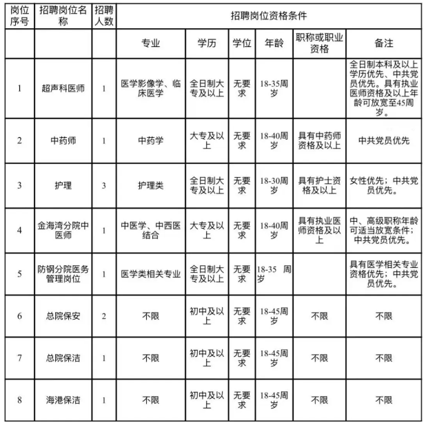為了解決醫(yī)院人員緊缺狀態(tài),完善科室設(shè)置,進一步提升醫(yī)療服務(wù)水平,確保醫(yī)療安全,更好地滿足企沙工業(yè)園區(qū)各大企業(yè)及廣大人民群眾醫(yī)療服務(wù)需求,特面向社會招聘11名工作人員,具體如下: