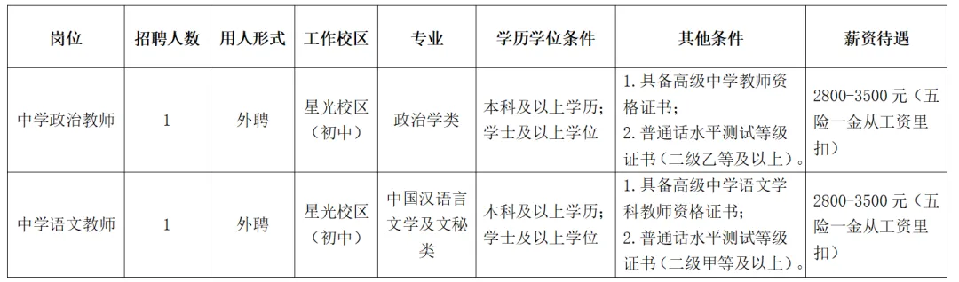 根據(jù)學(xué)校工作需要,南寧市第十中學(xué)星光校區(qū)(初中部)面向社會(huì)招聘教職工,具體崗位如下: