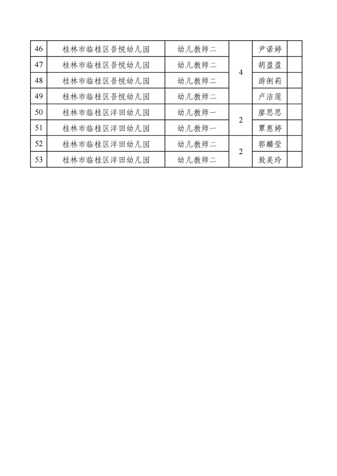 根據(jù)《桂林市2025年度公開招聘中小學教師公告》和《2025年桂林市臨桂區(qū)公開招聘中小學教師面試公告》規(guī)定,經(jīng)網(wǎng)上報名審核、筆試,現(xiàn)場資格復審、面試等程序,現(xiàn)將2025年桂林市臨桂區(qū)公開招聘中小學教師進入考核人員名單予以公示,公示時間為2025年7月21日至25日。公示期間如有異議,請以書面形式并署真實姓名和聯(lián)系方式于7月25日前將反映材料送達臨桂區(qū)委教育工委辦公室或臨桂區(qū)教育局人事股。如實反映有關(guān)問題受法律保護。