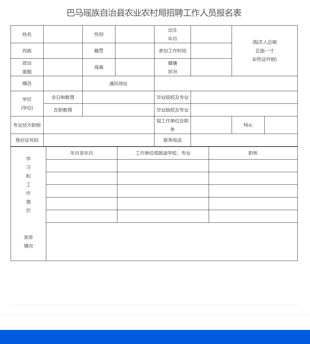 附件:巴馬瑤族自治縣農(nóng)業(yè)農(nóng)村局招聘工作人員報(bào)名表