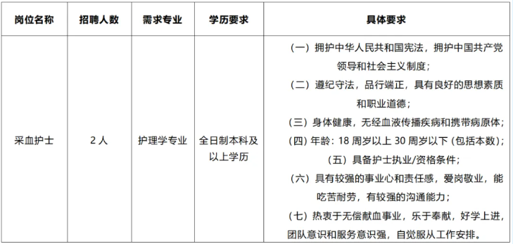 報名所需材料:《河池市中心血站公開招聘報名表》(附件)、個人簡歷、畢業(yè)證書、學位證書、護士執(zhí)業(yè)證/資格證、身份證等,若個人具備特長,需一并附上相關(guān)佐證材料。請攜帶以上材料原件及復(fù)印件至指定報名地點。應(yīng)聘人員應(yīng)對報名材料的真實性負責,凡弄虛作假的,一經(jīng)查實,即取消報名和聘用資格。