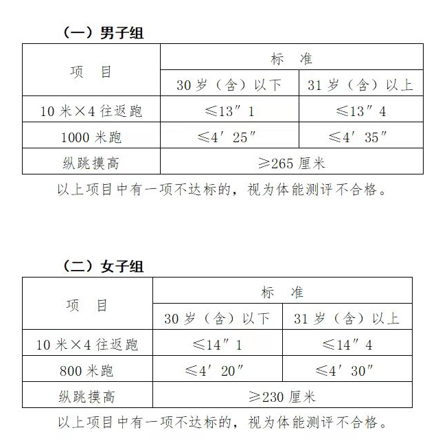 體測項目為縱跳摸高、10米×4往返跑和1000米(男)或800米(女)長跑,體能測試項目評分標(biāo)準(zhǔn)依據(jù)《公安機關(guān)錄用人民警察體能測評項目和標(biāo)準(zhǔn)(暫行)》執(zhí)行(見附件3),體能測試項目規(guī)則按照《公安機關(guān)錄用人民警察體能測評實施規(guī)則》執(zhí)行(見附件4)。