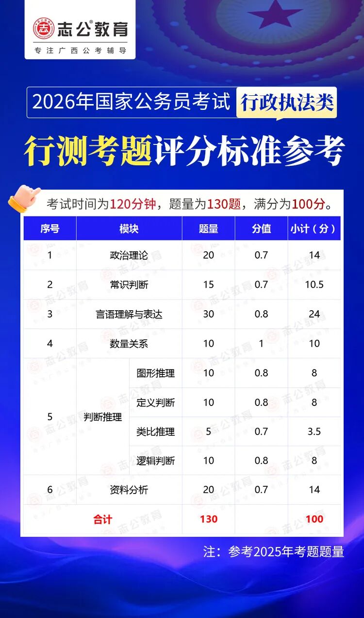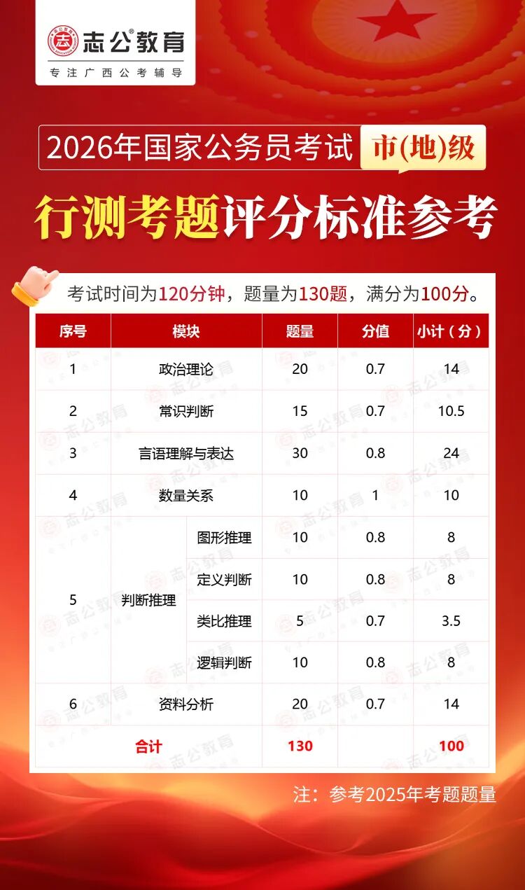 無論報名人數(shù)是否會增加,提升自身實力才是應(yīng)對2026年國考的關(guān)鍵。行測作為國考公共科目筆試的核心模塊,不僅分值占比高(通常為 100 分),更是考生之間拉開分差的關(guān)鍵戰(zhàn)場。它并非單純考查知識儲備,而是通過言語理解、判斷推理、數(shù)量關(guān)系、資料分析、常識判斷、政治理論六大板塊,綜合評估考生的信息處理速度、邏輯思維能力、應(yīng)急決策水平等綜合素質(zhì)。