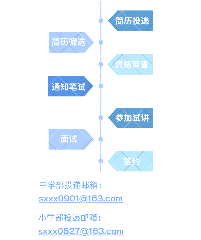 請將個(gè)人簡歷(Word或PDF版本)、一張個(gè)人生活照以電子郵件附件形式發(fā)送至報(bào)名崗位對應(yīng)的郵箱(如有作品,請將作品集一起發(fā)送到報(bào)名郵箱),郵件主題和附件文件名請備注:應(yīng)聘學(xué)科+姓名+畢業(yè)學(xué)校。