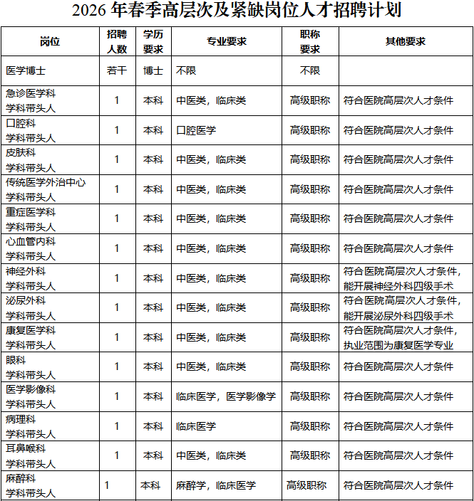 本著按需招聘,貫徹“公開、平等、競爭、擇優(yōu)”原則,現(xiàn)將2026年春季高層次及緊缺崗位人才招聘有關(guān)事項公告如下: