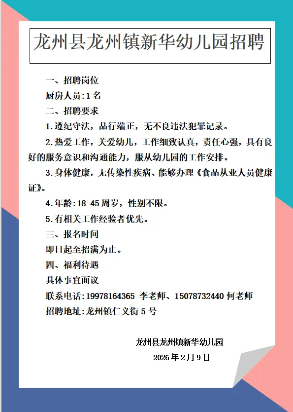 原文標(biāo)題:龍州縣龍州鎮(zhèn)新華幼兒園招聘
