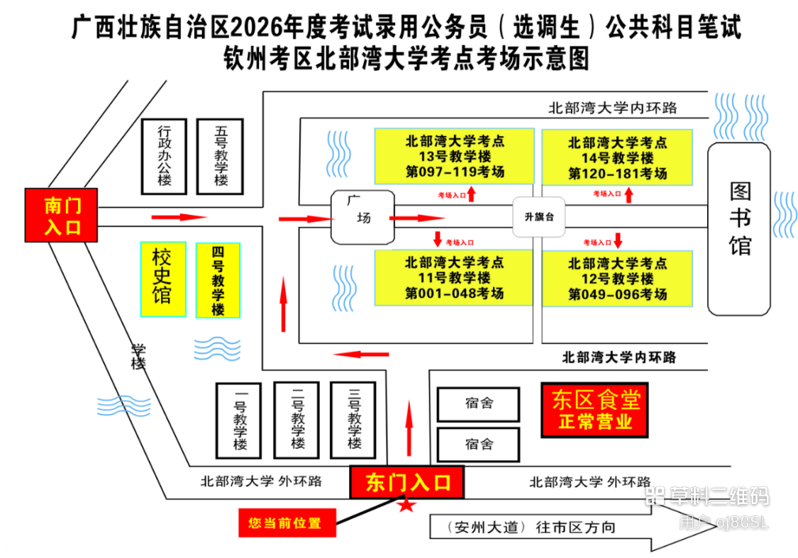 欽州考區(qū)共設(shè)三個(gè)考點(diǎn),分別為北部灣大學(xué)考點(diǎn)、北部灣職業(yè)技術(shù)學(xué)??键c(diǎn)、欽州市第五中學(xué)考點(diǎn)。(考點(diǎn)地址和具體考場安排請掃附后的二維碼查看)