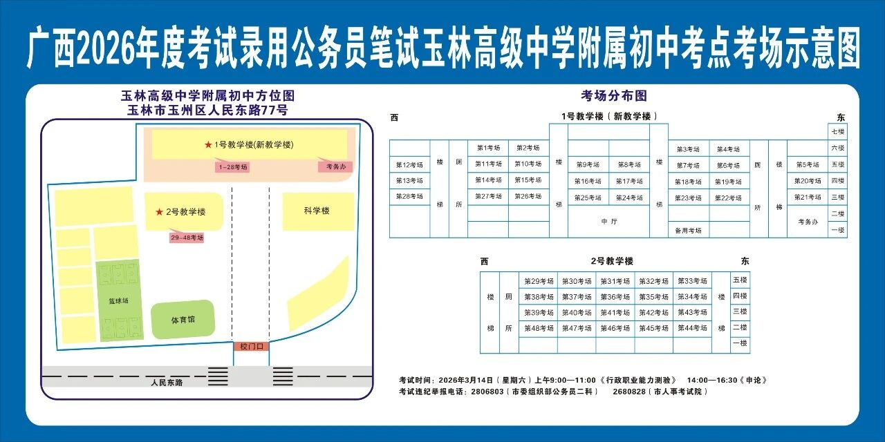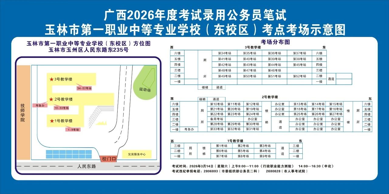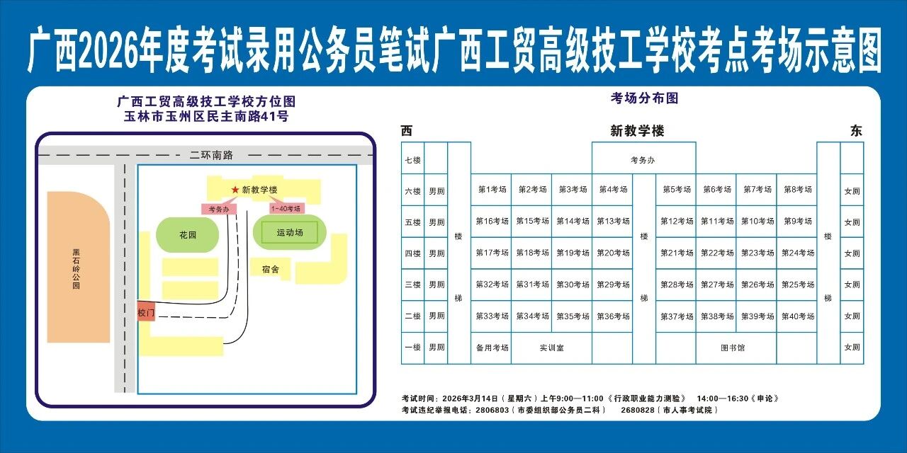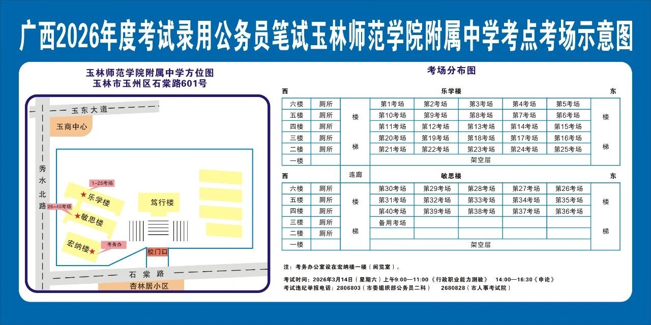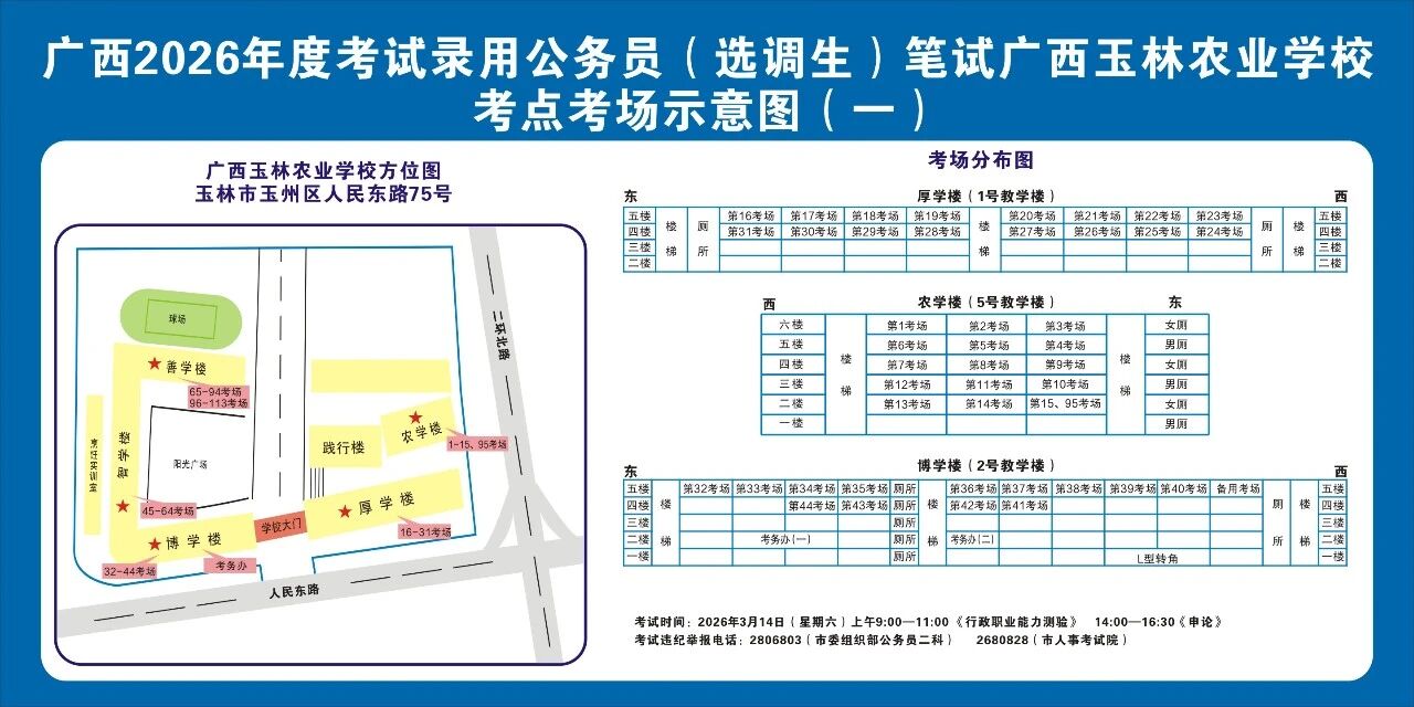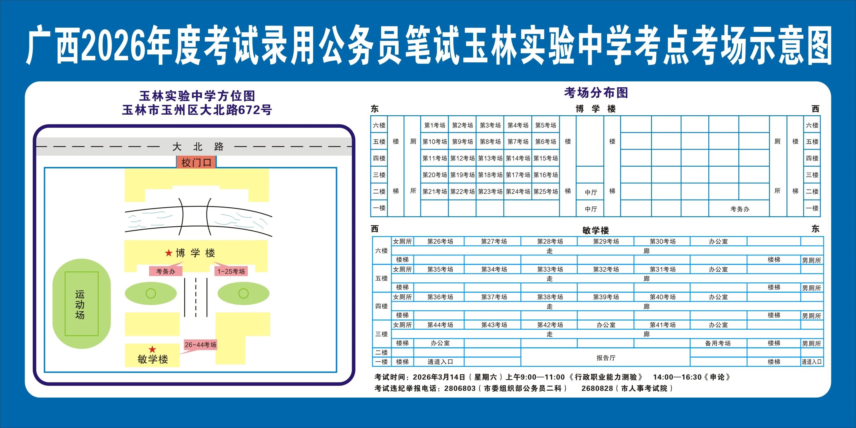 廣西2026年度考試錄用公務(wù)員(選調(diào)生)筆試將于3月14日舉行,為進一步提升玉林考區(qū)服務(wù)保障質(zhì)量,現(xiàn)就有關(guān)注意事項提示如下,請廣大考生做好應(yīng)試準備工作,準確掌握考試時間、考點地址及相關(guān)注意事項。