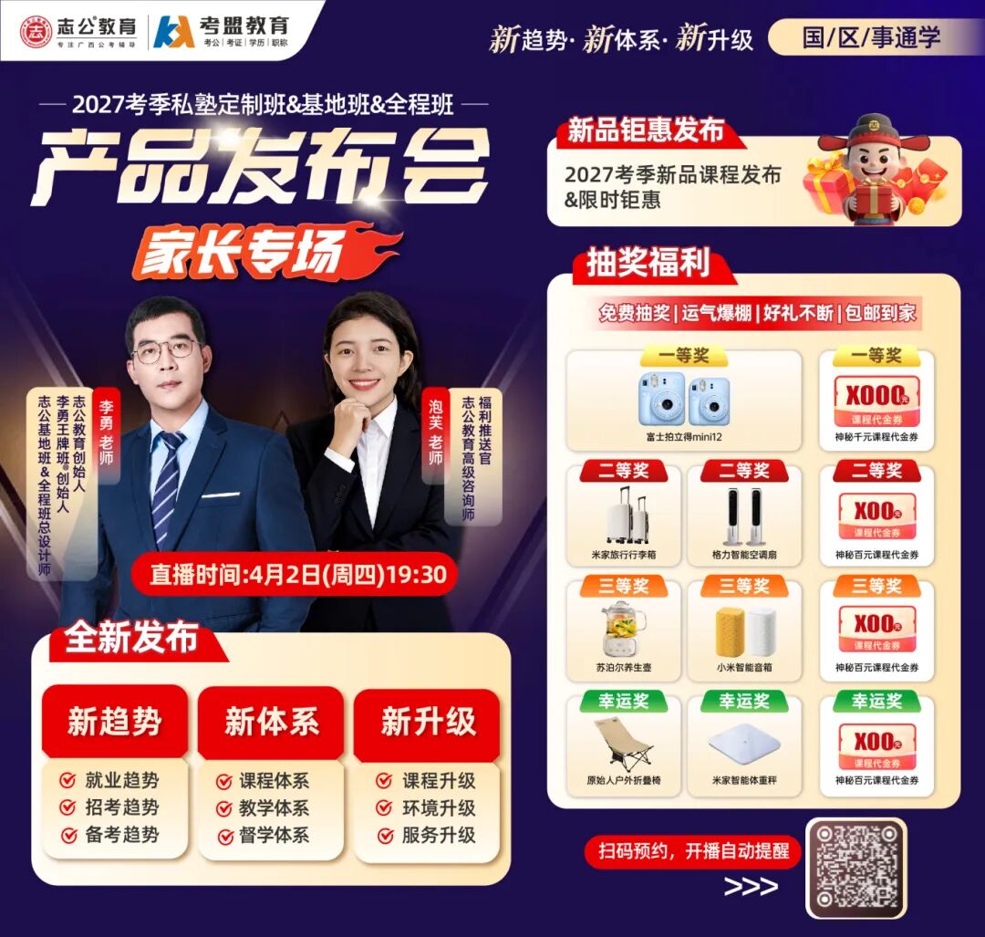 面對孩子棘手的就業(yè)與考公難題,家長們往往深感無力。針對這一系列關切的痛點,志公教育于4月2日(周四)19:30舉辦“新趨勢·新體系·新升級——2027考季公考產品發(fā)布會”重磅直播,從專業(yè)的角度分析解讀當前就業(yè)、招考、備考的新趨勢,為廣大學子及家長送上備考的“及時雨”,滿足家長和學子們對獲得更優(yōu)質的學習環(huán)境、課程體系、督學服務、教學成果的期待。同時直播間免費送出更多超值福利。