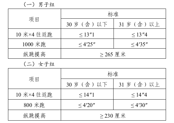 體能測評三項全部達標方為合格。其中:縱跳摸高的測試次數(shù)不超過3次,10米×4往返跑的測試次數(shù)不超過2次,1000米跑/800米跑的測評次數(shù)為1次。